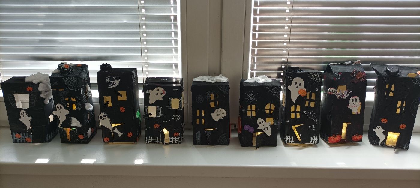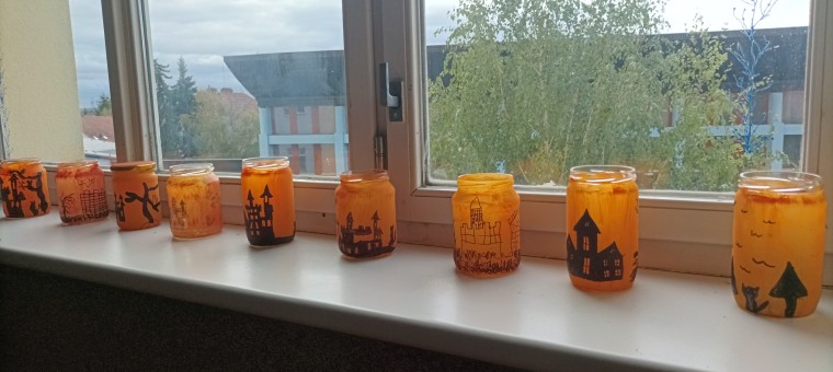S žáky šestých tříd jsme se v říjnu ve výtvarné výchově pustili do halloweenských příprav. Z obyčejných krabic od mléka jsme vytvořili neuvěřitelně strašidelné domy, které jsme rozsvítili pomocí elektrických žárovek. Také ze zavařovacích sklenic nám vznikly halloweenské svícny. Vše nám ve škole vytváří krásnou podzimní atmosféru.