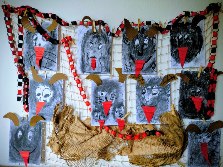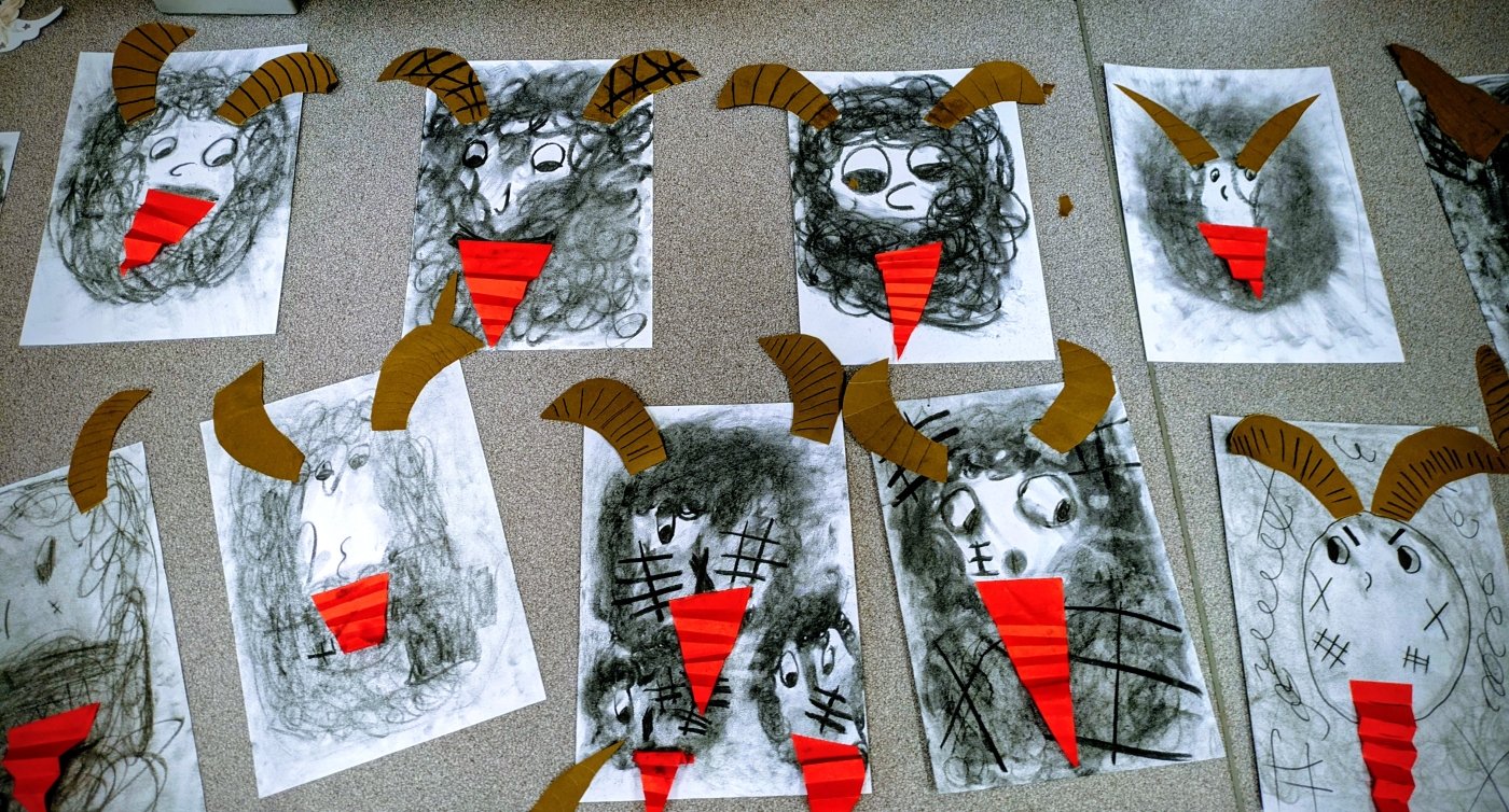 Ztvárnění čerta uhlem a andílků se dětem z 2. A mimořádně povedlo. Snad se budou líbit i Mikuláši.