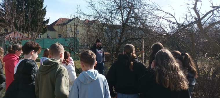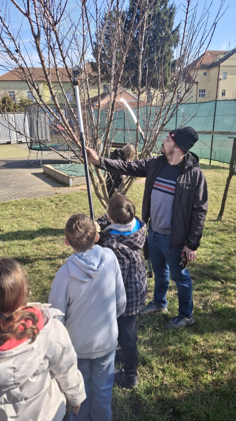 Za příjemného jarního sluníčka jsme vyslechli zajímavé teoretické, odborně-dendrologické informace o ovocných stromech, a také seznámení s vhodným nářadím pro jejich údržbu. Právě v tomto období předjaří je totiž vhodné tyto stromky prořezávat. Následně jsme mohli shlédnout konkrétní ukázku jejich ořezu, žáci si mohli pod dohledem i samotné řezání a stříhání vyzkoušet. Jabloňka Jarmilka, kterou si žáci na podzim zasadili, byla také zastřižena, aby správně rostla a dobře prospívala. Informace a doporučení, které jsme díky tomuto výkladu a ukázce získali, byly velmi užitečné. Snad alespoň nějaká praktická zajímavost v dětech uvízla.